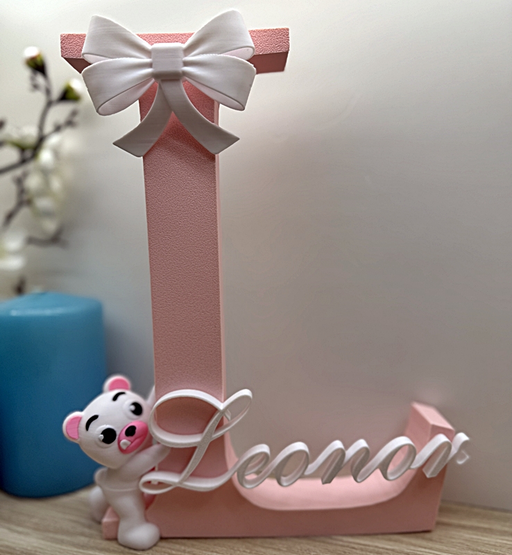 Dá um toque doce, delicado e cheio de ternura ao quarto da bebé ou da criança com a nossa Letra Decorativa de Menina, adornada com um urso fofo com laço e o nome personalizado.