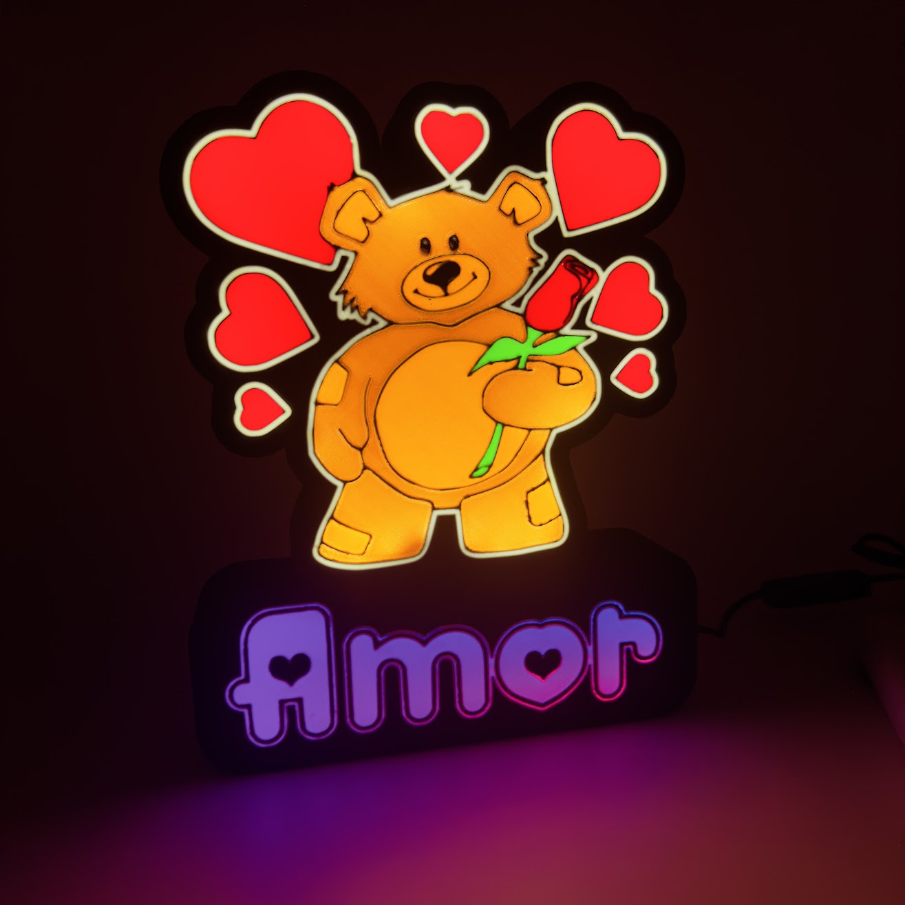 O adorável ursinho ganha vida com luz branca suave, enquanto o nome personalizado brilha em cores RGB ajustáveis, para que possas mudar as cores e a intensidade conforme o teu estado de espírito — romântico, relaxado ou alegre. 🎛️💡