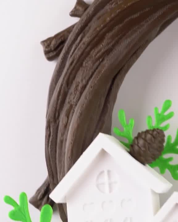 O design que imita madeira combinado com pequenas casinhas, pinhas naturais e detalhes festivos cria uma decoração calorosa, perfeita para quem adora o estilo rústico, natural e tradicional do Natal. Ideal para portas, paredes, lareiras ou entradas! 🎁🏠